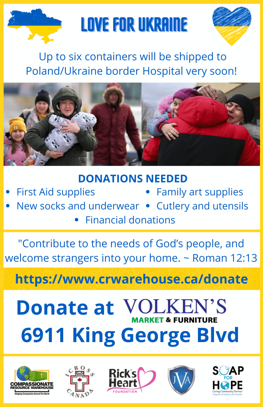 If you live on the lower mainland, you can drop donations off at John Volken Market at 6911 King George Blvd from 9 am to 8 pm Mon-Sat.